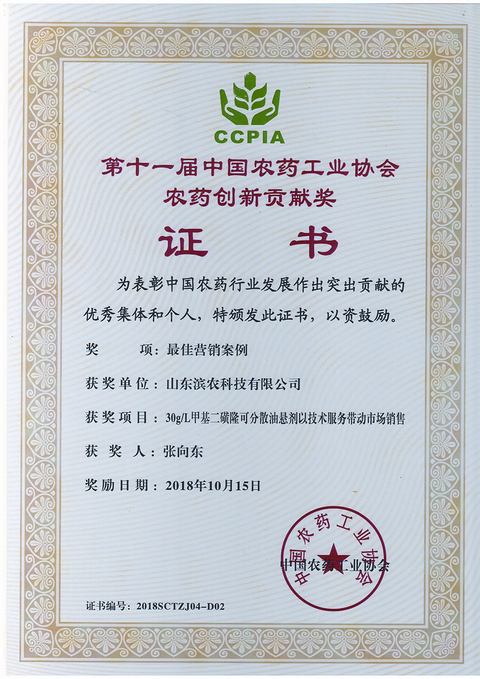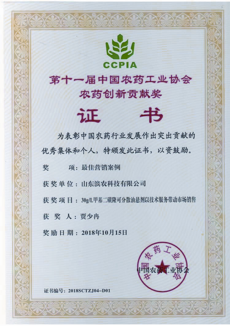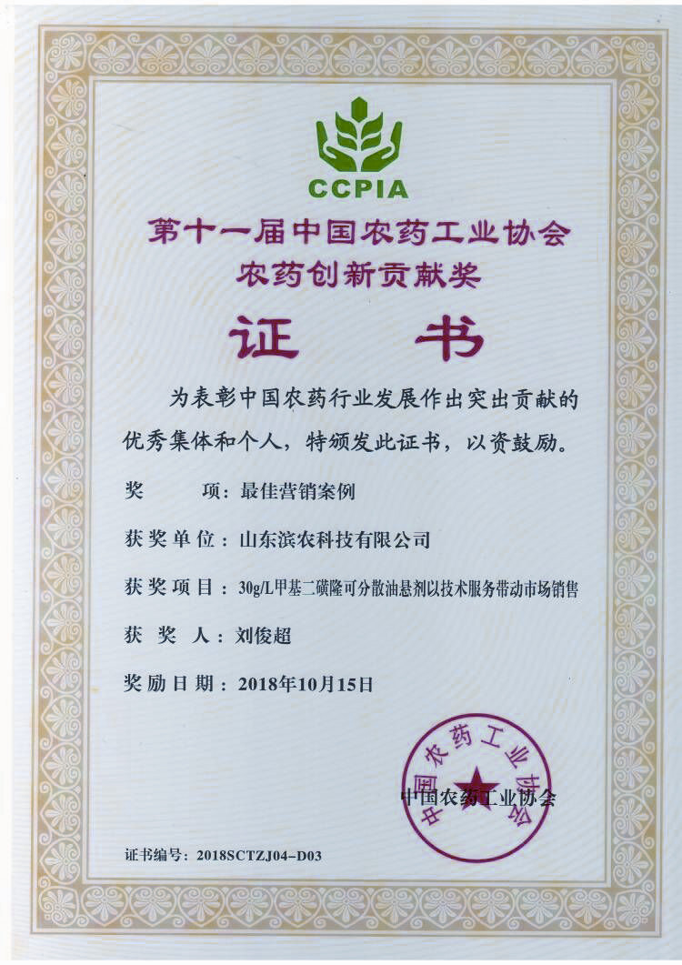 ■2018-10-15 我公司“30g/L甲基二磺隆可分散油懸劑以技術(shù)服務(wù)帶動市場銷售”榮獲“中國農(nóng)