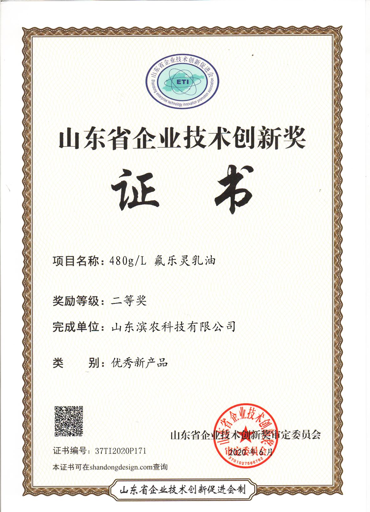 ■2021-04-08 2020-08-05 我公司新產(chǎn)品480g/L氟樂靈乳油榮獲山東省企業(yè)技術(shù)創(chuàng)新獎優(yōu)秀新產(chǎn)品二